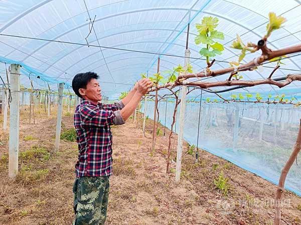 時下正值大棚葡萄管護期,走進朱集鎮星光村嘉莉葡萄園,大棚內一派生機盎然,一株株葡萄藤吐著翠綠新葉,一串串花穗掩映在清新葉片中,旺盛地生長著,幽香撲鼻。種植戶曹配明正帶領工人們進行掐穗、整理枝條、加固大棚鋼管、翻曬雞糞等農事管理。看著葡萄園里熱鬧的景象,老曹喜在臉上、甜在心里。