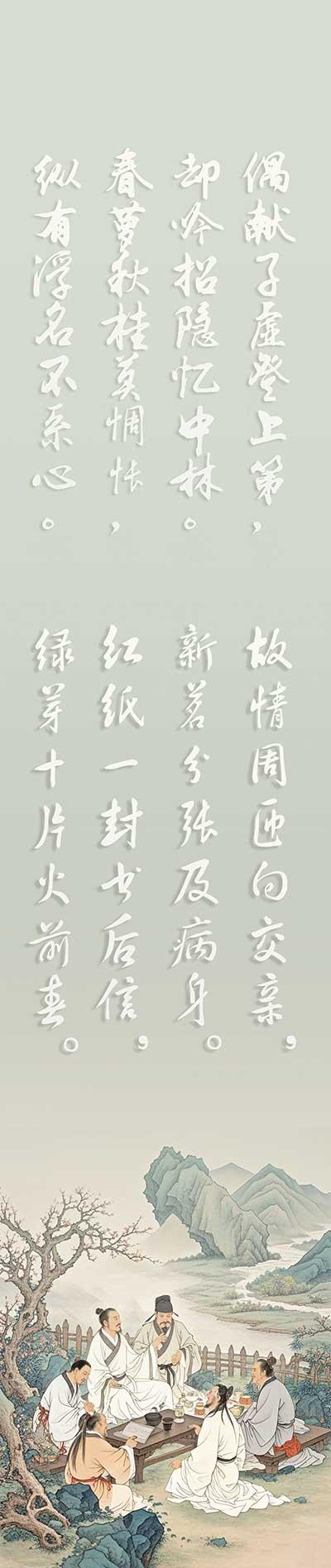 離開符離后,白居易的仕途幾經沉浮。他經歷過科舉高中的喜悅,也遭受過被貶謫的痛苦;體驗過官場的得意,也品嘗過人生的失意。但無論身處何種境地,他與“符離五子”的情誼始終歷久彌新。貞元十六年,白居易進士及第,他第一時間便寫信給劉翕習,與他分享這份喜悅,在信中,他詳細地描述了自己考試的過程和中第后的心情,同時也表達了對故友的思念之情;元和十二年,白居易收到蜀中友人寄來的新茶,他看著那嫩綠的茶葉,泡在水中漸漸舒展,仿佛看到了符離的山水和故友的面容,于是,他在《謝李六郎中寄新蜀茶》中寫下“故情周匝向交親”的佳句,借茶寄情,抒發對符離故友的深切思念。