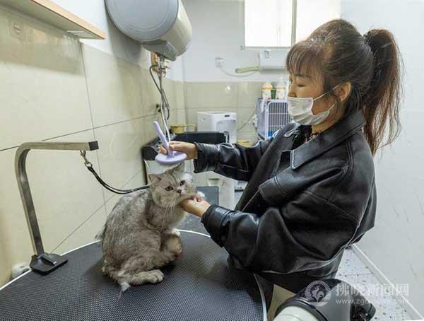 4月22日,在宿城澮水路一萌寵店,店老板在為小貓梳毛。