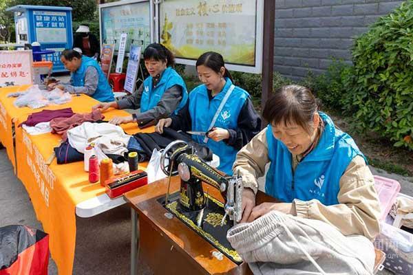 5月18日,志愿者在埇橋區南關街道九中社區為居民縫補衣服。 記者 蔣幫煜 攝