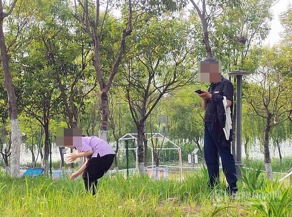 近日,在宿州汴河博物館附近,雖有圍欄阻擋,仍有游客隨意踩踏景觀草坪。本報記者 攝