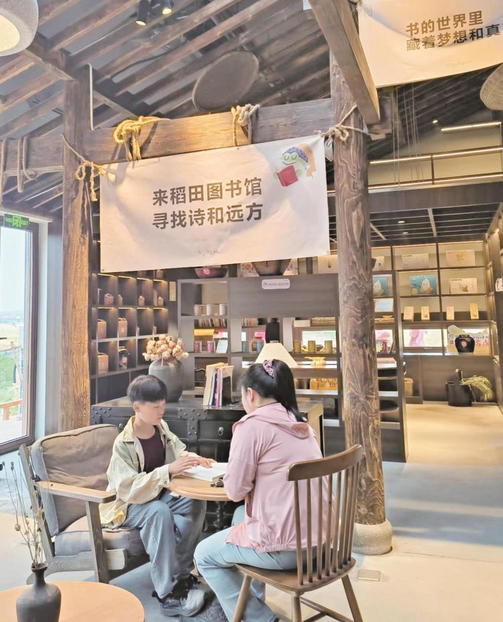 游客在埇橋區(qū)夾溝鎮(zhèn)鎮(zhèn)頭村的稻田圖書館享受假日書香。本報(bào)記者 攝