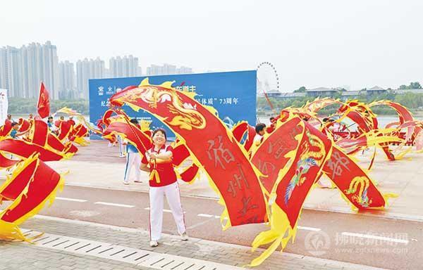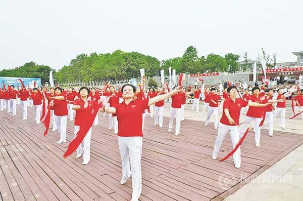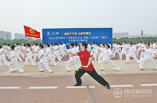拂曉新聞網--拂曉報訊(文/通訊員 楊旭 圖/特約攝影 張成伍)日前,我市紀念毛澤東題詞“發展體育運動 增強人民體質”73周年全民健身主題活動在宿州市新汴河景區拉開帷幕。此次活動由市教體局主辦、市各體育運動協會承辦,同時也拉開了“喜迎十六運 當好東道主”系列活動的序幕。來自全市10多個體育運動協會的近千名體育健身愛好者同場獻藝,掀起全民健身熱潮。
