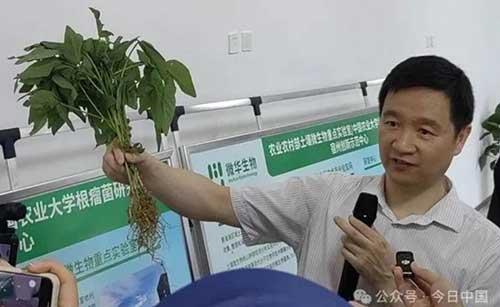 大豆蛋白質含量高,通常超出普通谷物的四五倍,秘密就藏在根部一串串小瘤中。中國農業大學生物學院副院長、農業農村部土壤微生物重點實驗室主任樓慧強解釋說,這些瘤是由一種叫根瘤菌的微生物侵染大豆根部形成,不僅能提高大豆的蛋白含量,還能有效提高大豆產量。此外,“中國化肥的利用率平均不到40%,不僅造成了大量浪費,還造成了面源污染。”樓慧強指出,小小的根瘤菌能將空氣中的氮轉化為植物可吸收的氨,為農業綠色發展提供了重要支撐。