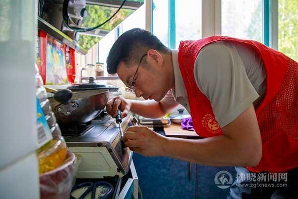 7月12日,埇橋區南關街道九中社區工作人員正在上門檢修灶具。為切實解決居民生活難題,提升社區服務水平,當日,該社區開展“便民服務進社區”公益活動,為周邊居民提供家具檢修、家電維修等服務,贏得居民好評。記者 蔣幫煜 攝