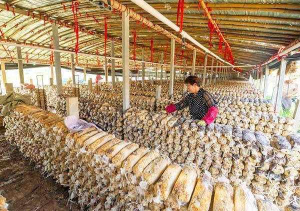村民在毛木耳大棚里管理菌包。記者 蘇洋 攝