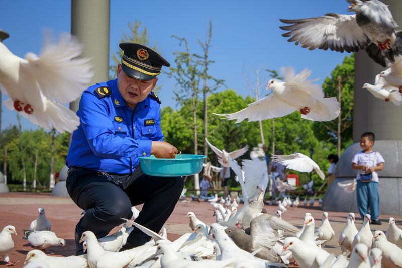 烈日下,張威在喂養三角洲公園的和平鴿。 記者 蔣幫煜 攝