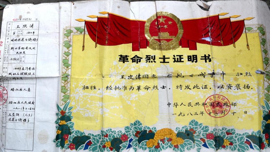 王益樸珍藏的王次青革命烈士證明書。 李艷龍 攝