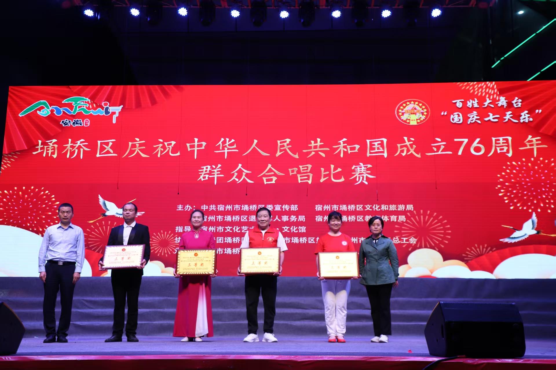 10月1日,宿州市文化藝術中心露天劇場內,鮮艷的紅旗迎風招展,激昂的歌聲響徹全場。埇橋區慶祝中華人民共和國成立76周年群眾合唱比賽在此火熱開唱,來自9支合唱藝術團的數百名演員依次登臺,用嘹亮歌聲傳遞對祖國繁榮昌盛的真摯祝福。經過緊張激烈的比拼,埇橋區教師合唱團斬獲特等獎,埇橋區大海藝術中心女聲合唱團摘得一等獎。