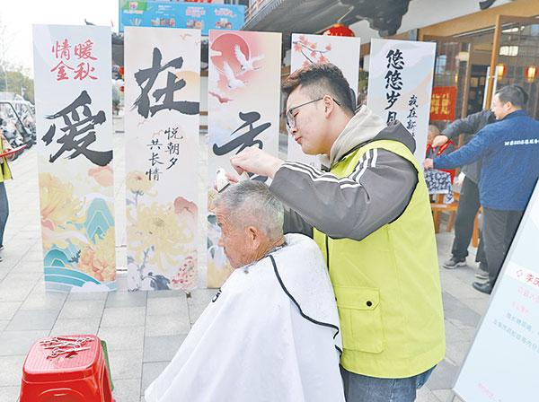 在義診區,縣人民醫院神經內科主任朱啟云叮囑老人秋冬季節保健常識;便民服務區內,剛理完發的周強大爺照著鏡子笑得合不攏嘴;“夕陽映像”老年人免費拍照點前,68歲的董英和老伴拿到了珍貴的合影,激動不已。