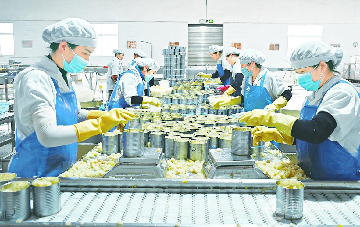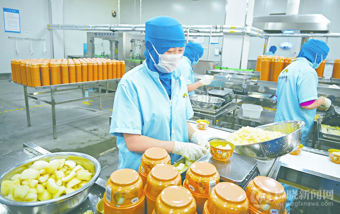 碭山倍佳福食品有限公司工作人員正在加工梨罐頭。