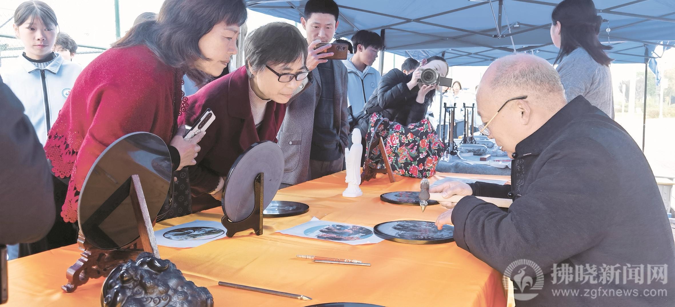 活動(dòng)現(xiàn)場(chǎng),靈璧鐘馗畫、磬石雕刻、剪紙鐘馗、衍紙技藝、金屬雕刻、白靈石雕刻等展位前吸引了眾多師生駐足。非遺代表性傳承人們現(xiàn)場(chǎng)展示精湛技藝,與學(xué)生們親切互動(dòng),耐心講解技藝特點(diǎn)與文化內(nèi)涵,讓同學(xué)們零距離感受非物質(zhì)文化遺產(chǎn)的獨(dú)特魅力。隨后的非遺節(jié)目展演在極具地方特色的磬石琴演奏《滿工對(duì)唱》中正式開場(chǎng)。激昂的鼓韻《盛世歡歌》、高亢嘹亮的菠林喇叭《百鳥朝鳳》、氣勢(shì)磅礴的琵琶合奏《楚漢驕雄》、清越的女聲組合唱《春風(fēng)十萬里》以及精彩的琴鼓聯(lián)唱《多彩家園》等節(jié)目輪番上演,贏得了現(xiàn)場(chǎng)觀眾的陣陣掌聲。