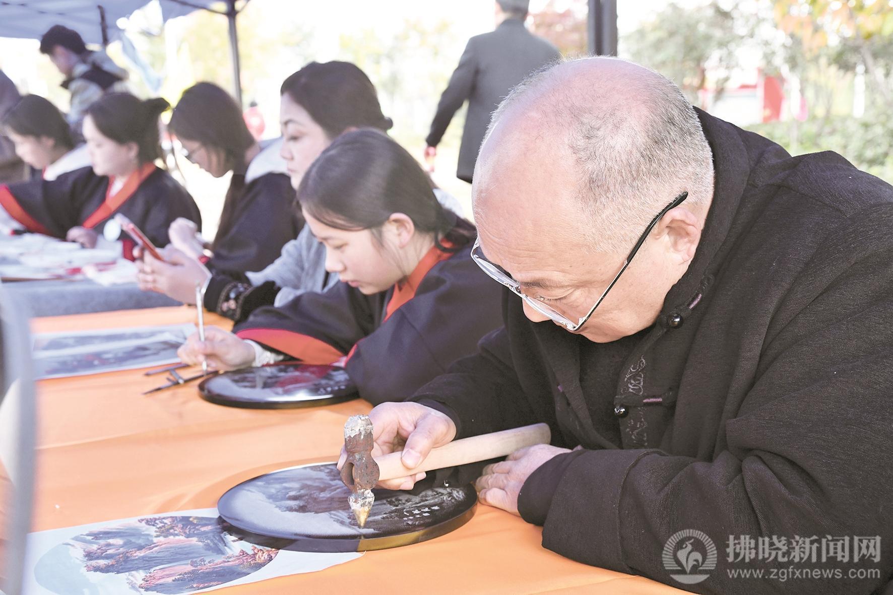 同學(xué)們紛紛拿起工具,跟著非遺代表性傳承人學(xué)習(xí)磬石雕刻。