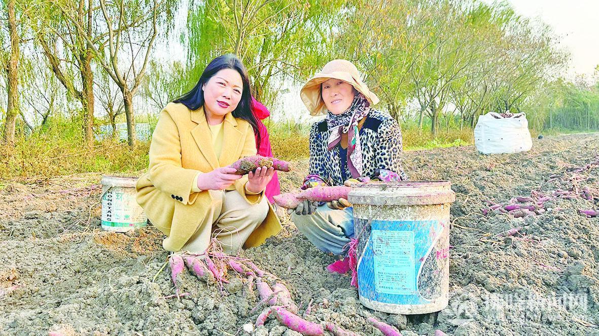 高慧(左)和農戶一起展示剛挖出的蜜薯