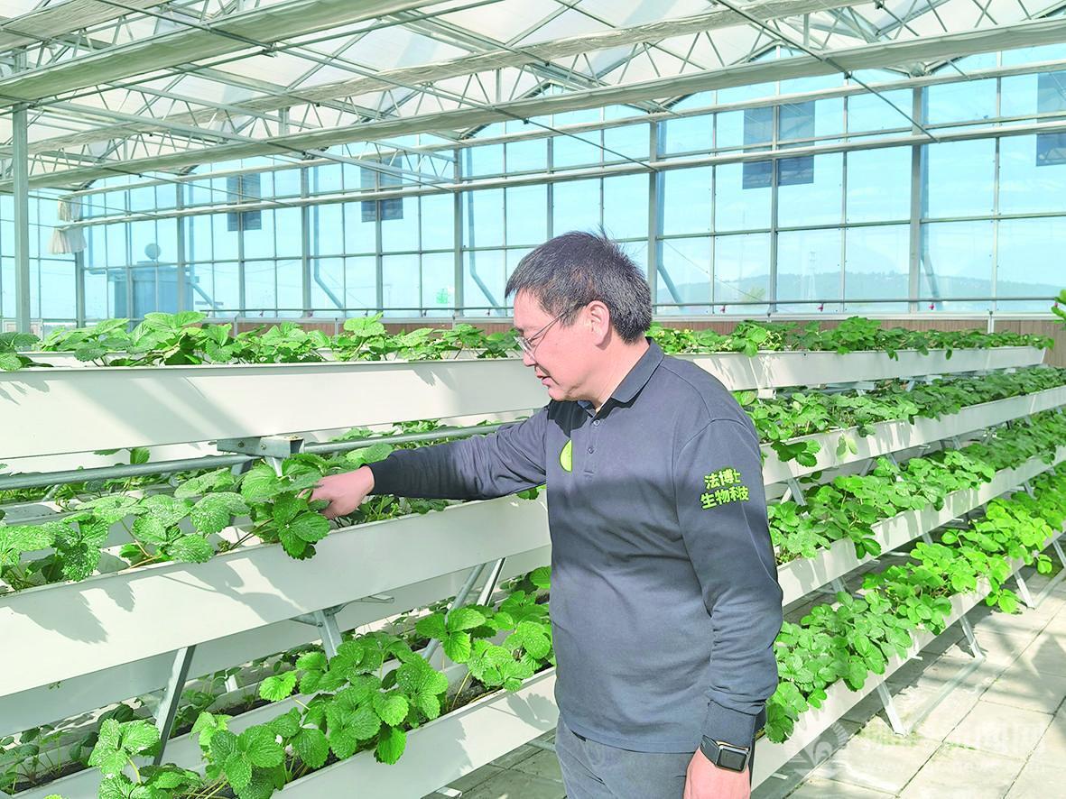 圖為屏山鎮蚯蚓生態循環產業示范園負責人王玉平在示范田里檢查立體草莓的生長情況。