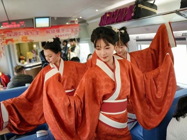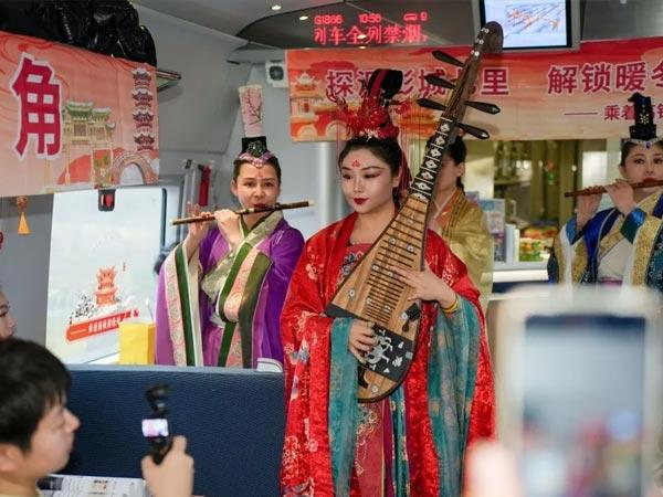 在推介活動中,江蘇省柳琴劇院四位專業演員現場演奏經典曲目,三位高鐵乘務員身著漢服翩然起舞。車廂內,車窗貼著徐州戲馬臺等彭城七里景觀的活動主題標識,座位上也展示了各色馬莊香包與文旅宣傳冊頁,歷史文化名城的魅力在每一個細節中綻放。
