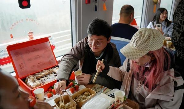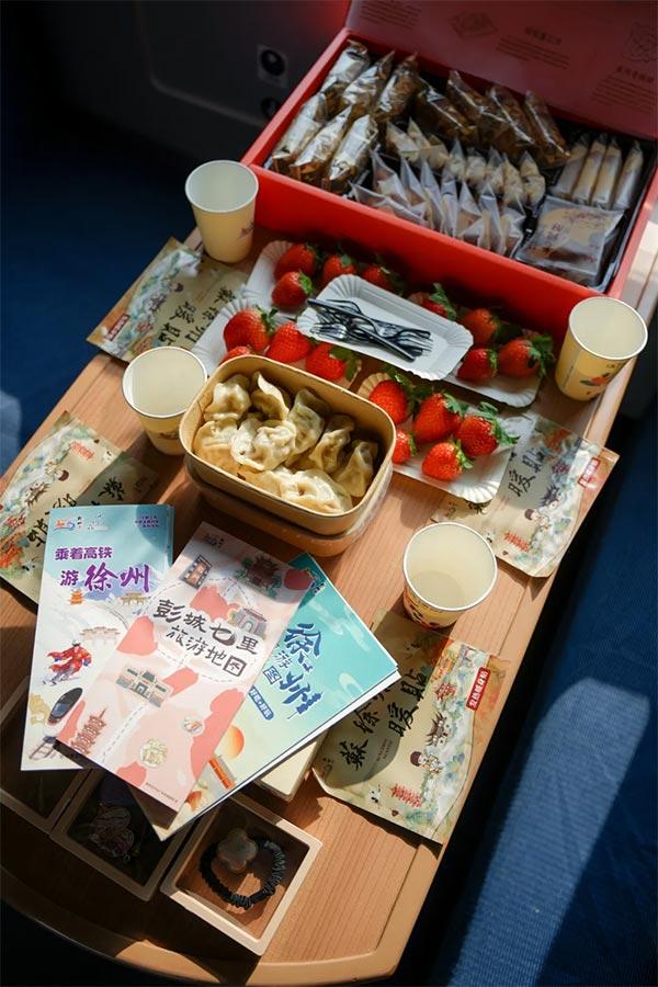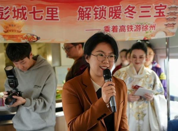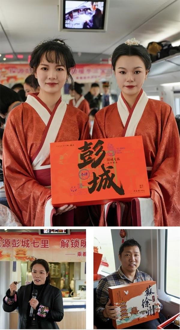 徐州文旅推介官向餐車上的旅客重點推介了“彭城七里”歷史文脈與徐州“暖冬三寶”(滑雪、草莓、賈汪炒雞)等特色冬季文旅資源,展現徐州“歷史人文+冰雪運動+非遺美食”的多元魅力。