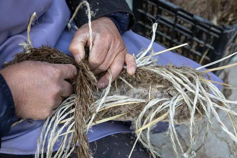 孫振坤在穿苘麻繩。