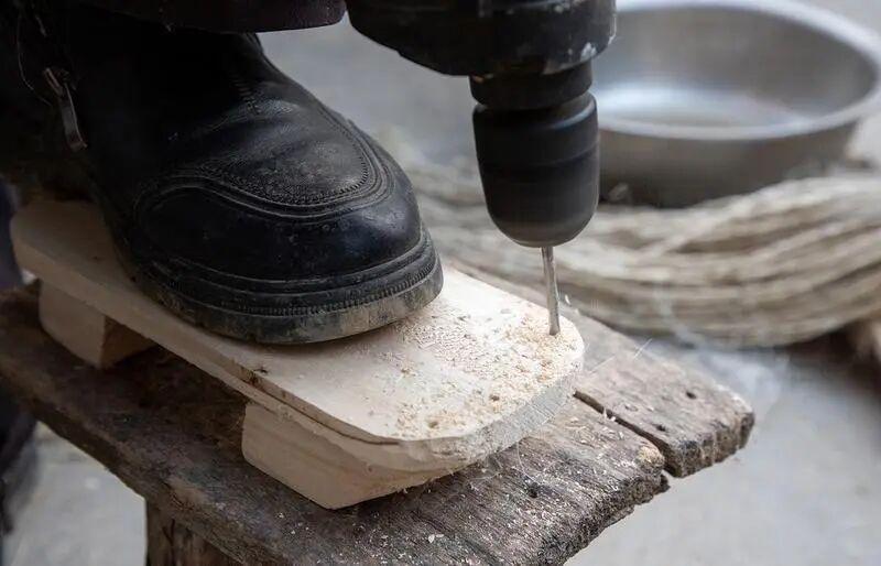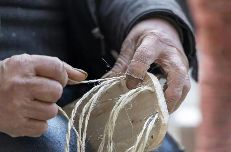 冬日的蕭縣馬井鎮閻廟村,河畔的蘆花隨風搖曳,平添了幾分寒意,孫振坤的小院里卻暖意融融。走進小院,記者看到59歲的孫振坤正坐在小板凳上,手指翻飛,一縷縷蘆纓和麻繩在柳木鞋底上交織,一只厚實的茅窩逐漸成形。身旁幾位老人默契協作,鑿木底、搓麻繩、編蘆纓,院角還曬著幾雙剛完工的茅窩?!班钡蔫從韭?、“沙沙”的搓繩聲與談笑聲此起彼伏,好似一段繁忙的冬日序曲。“茅窩是咱蕭縣人過冬的老物件,就認手工打制的暖和勁,這些都是十月古會上的訂單。”孫振坤笑著告訴記者,手里的活計不停。