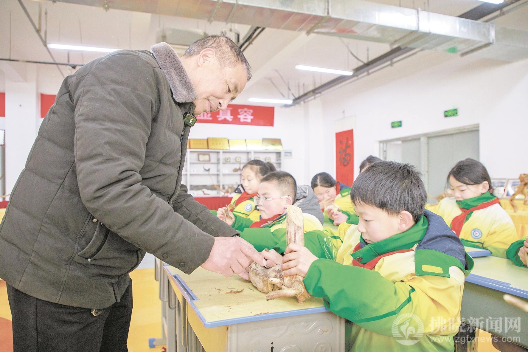 在學校根藝社團課上,為孩子們講解根藝制作技法。
