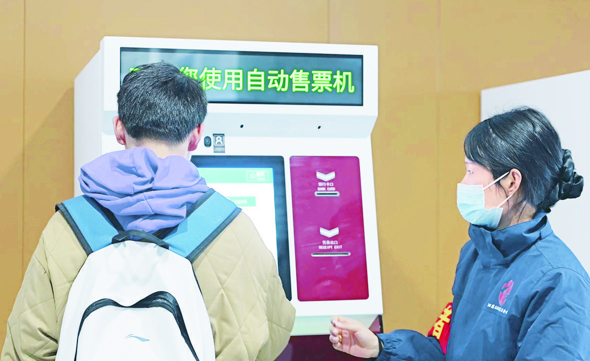 志愿者幫助旅客在售票機購票