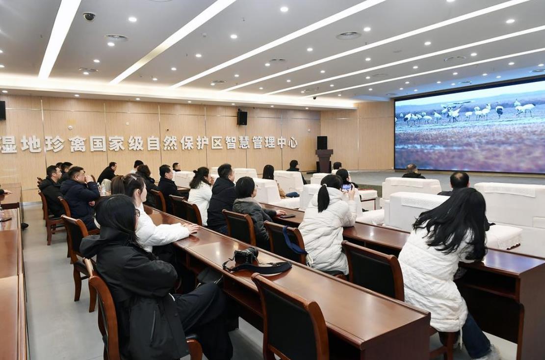 行程首站,丹頂鶴博物館內,圖文展板、影像資料系統呈現了丹頂鶴的生物學特征、東亞—澳大利西亞候鳥遷飛路線,以及濕地生態系統的核心價值。“保護區擁有各類動物1855種、高等植物697種,被譽為東部沿海‘國家重要濕地基因庫’,這份生態家底來之不易。”聽完工作人員講解,嘉賓們頻頻點頭,紛紛駐足記錄。