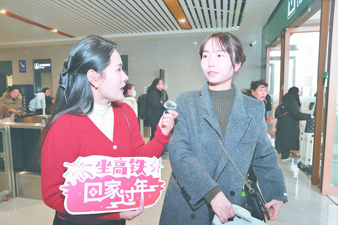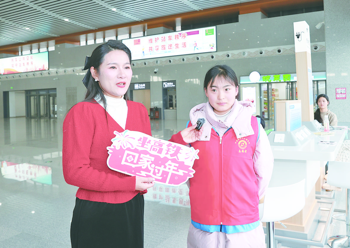 直播間同步發(fā)布泗縣返鄉(xiāng)務工需求,邀請人社局工作人員開展養(yǎng)老保險政策宣講,并設置新春送福環(huán)節(jié)。鏡頭前,旅客們紛紛送上新春祝福,言語間滿是對團圓的期待、對家鄉(xiāng)的熱愛。直播現(xiàn)場還為受訪群眾送上紅圍巾、春聯(lián)等暖心禮品,把暖心服務與政策宣講送到旅客身邊,讓歸途更有溫度、更具實效?!拔沂歉舯阢艉槿?,往年去杭州要坐好幾個小時大巴,今年聽說泗縣東站通高鐵了,我就帶著媽媽一起坐高鐵去杭州過年,節(jié)省了不少時間,泗縣東站服務很貼心,一路都有人幫忙?!闭诤蜍噺d等待乘車的侯先生高興地說。