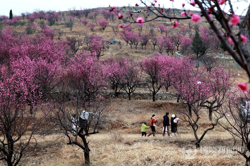 2月25日,在蕭縣永堌鎮王山窩村梅園,游人漫步花海,盡享春日“梅”好時光。近期,王山窩村數千畝梅花迎來盛花期,山坡上,紅梅似火,白梅如雪,層層疊疊綴滿枝頭,與遠山、水庫構成一幅壯美畫卷。