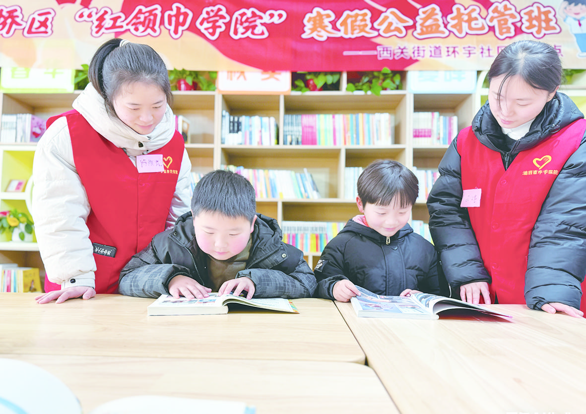 在團(tuán)區(qū)委組織的埇橋區(qū)“紅領(lǐng)巾學(xué)院”寒假托管公益課堂環(huán)宇社區(qū)服務(wù)點(diǎn)上,大學(xué)生志愿者正陪伴孩子們閱讀。