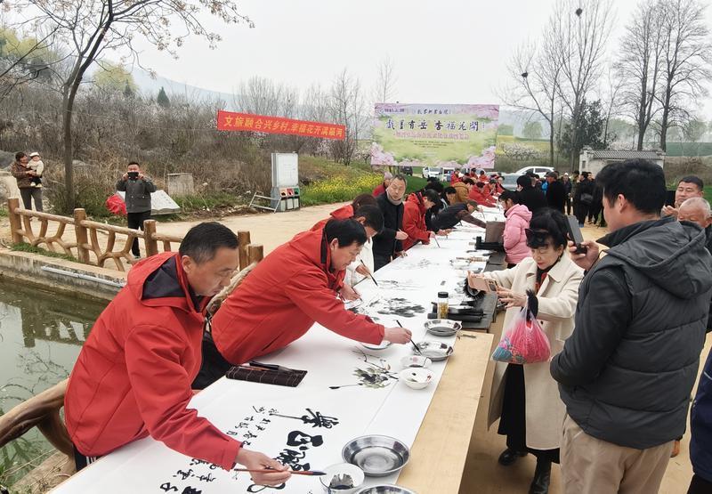 3月15日,埇橋區(qū)順河鎮(zhèn)岳喬村第五屆杏花文化節(jié)書(shū)畫(huà)筆會(huì)在乾山角下開(kāi)展。埇橋區(qū)文聯(lián)組織40多名書(shū)畫(huà)愛(ài)好者現(xiàn)場(chǎng)潑墨獻(xiàn)寶、切磋交流,埇橋區(qū)花鼓戲劇團(tuán)搭臺(tái)唱戲,吸引眾多村民和游客前來(lái)看杏花、拍美照、聽(tīng)大戲、賞書(shū)畫(huà)。