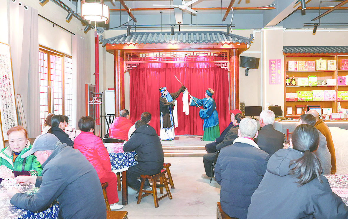 環顧四周,漕運古圖、老船構件、碼頭舊照片巧妙點綴,仿佛穿越時空。上午10點,鑼鼓梆子準時敲響,青年演員一襲彩裝,一曲泗州戲《拾棉花》聲動梁塵。老戲迷閉目叩節,年輕人舉著手機直播。