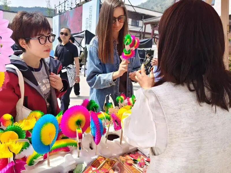 2025年皇藏峪首屆文化旅游季,趙厚真展示的紙翻花作品,受到外國游客的喜愛。