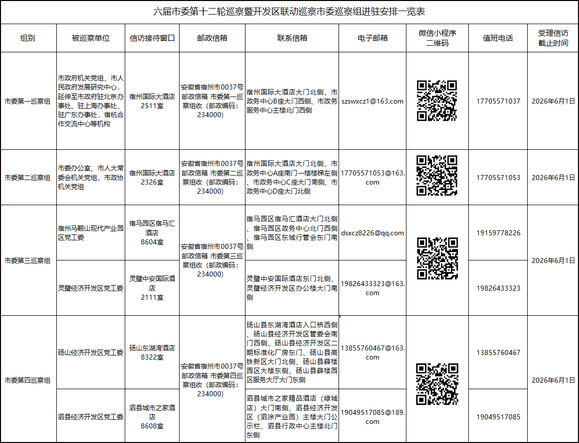 六屆市委第十二輪巡察暨開發區聯動巡察市委巡察組進駐安排一覽表