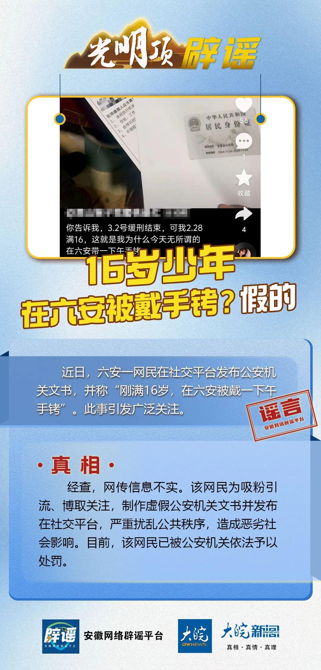 光明頂辟謠 | 16歲少年在六安被戴手銬?假的