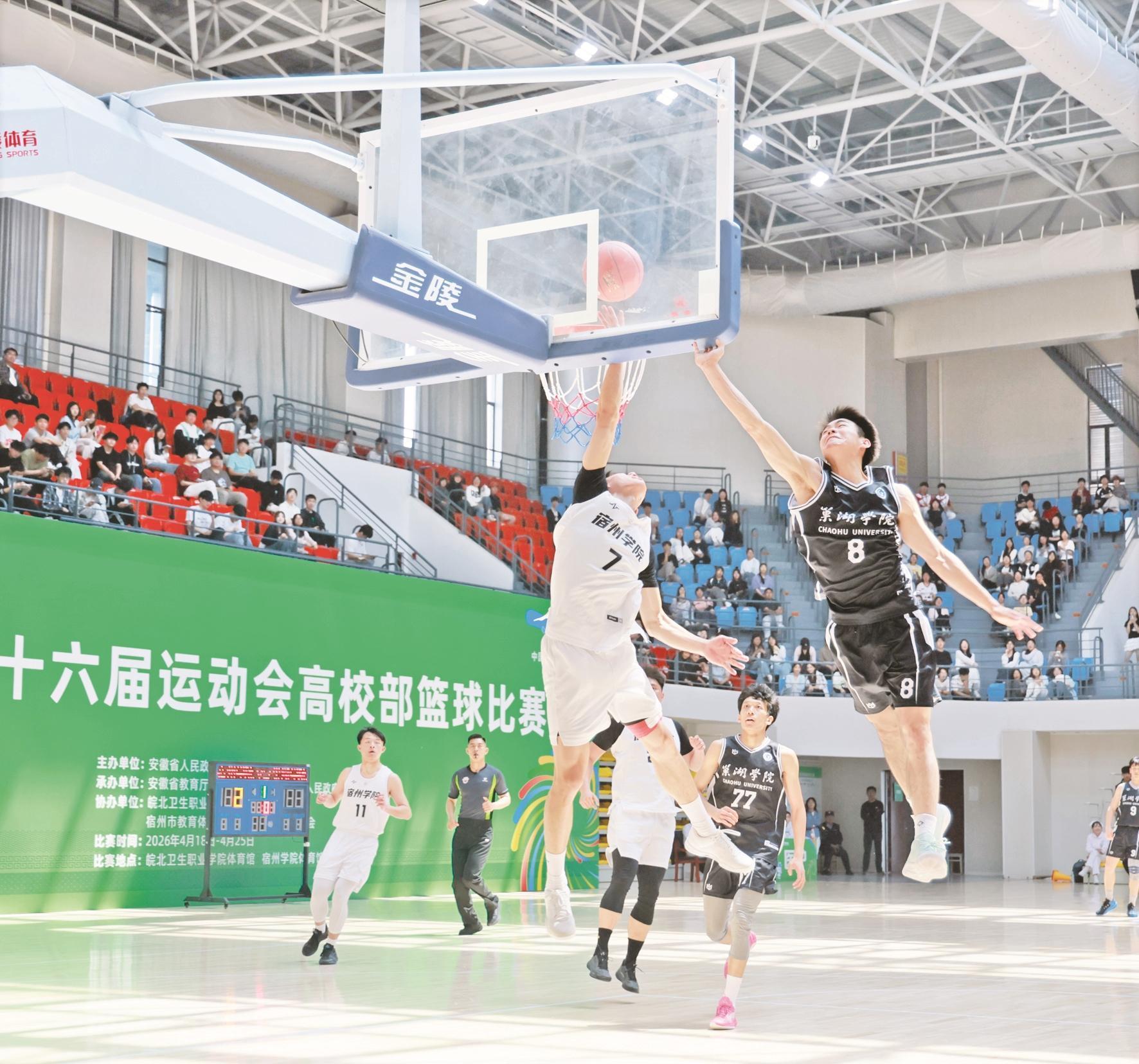 本次比賽于4月18日至25日在皖北衛生職業學院、宿州學院舉辦,共有來自全省46所高校的62支代表隊參賽。比賽期間,各代表隊運動員同臺競技、切磋交流、奮勇拼搏,嚴守賽場規則,充分賽出了風格、賽出了水平,呈現了多場精彩的籃球對決。