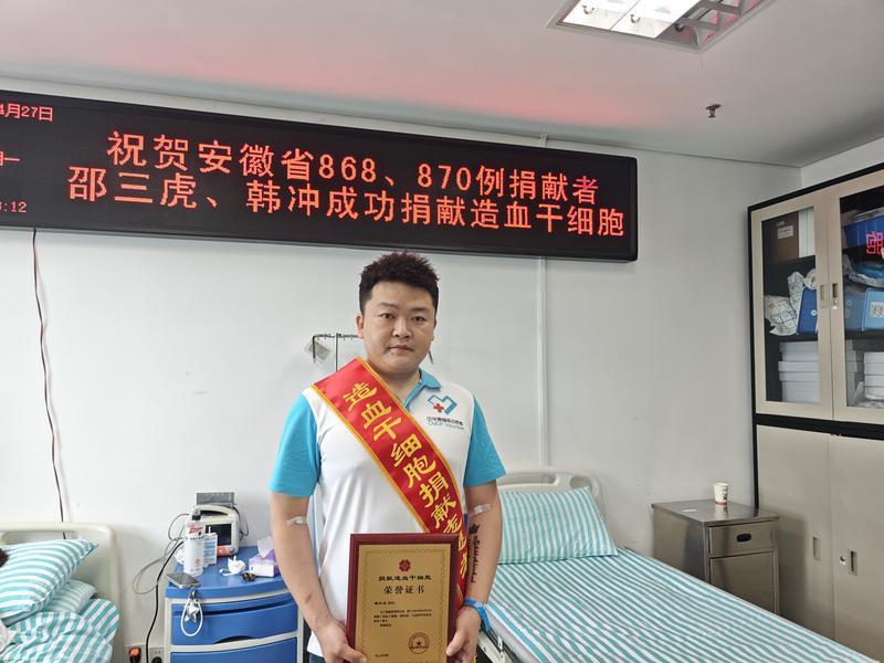 當天上午,在血液分離機的嗡鳴聲中,能夠挽救生命的造血干細胞從邵三虎的身體里提取出來。隨后,這袋“生命的種子”被送往外地醫院,用于治療一名血液病患兒。他成為安徽省第868例、宿州市第70例造血干細胞捐獻者。