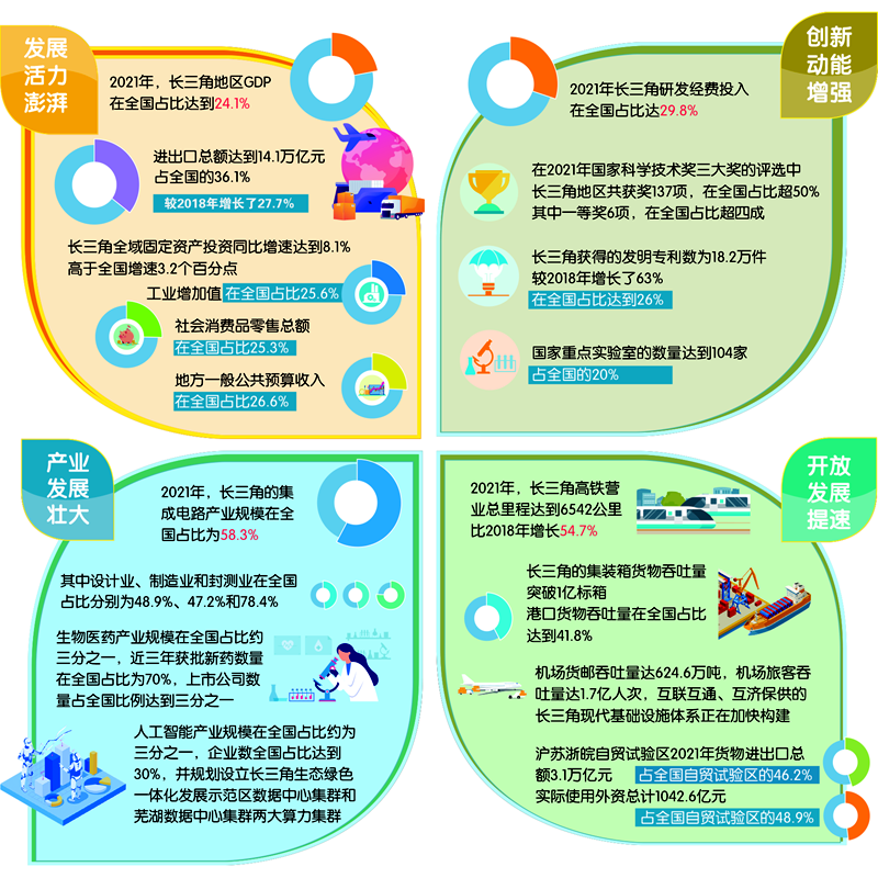 從投資到進出口,再到工業、消費和財政收入,這些指標都反映了2021年長三角經濟發展的平穩向好態勢,也彰顯了長三角在全國發展大局中的重要地位。