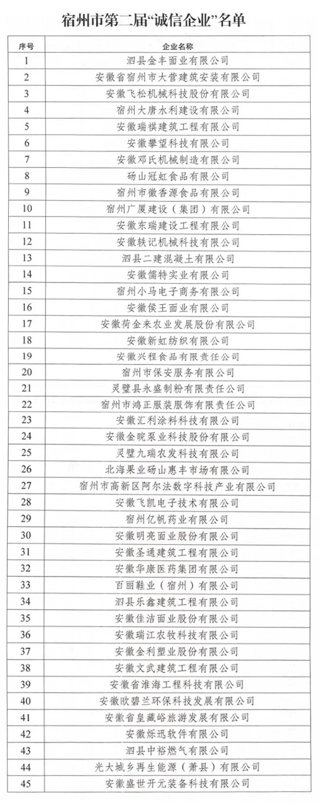 宿州市第二屆“誠信企業”名單揭曉