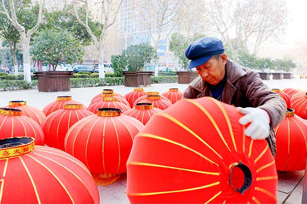 工人師傅在整理燈籠準備懸掛。 特約攝影 丁輝