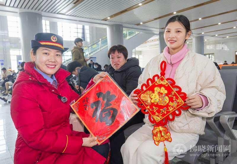 1月26日,2024年春運(yùn)拉開帷幕。當(dāng)日,宿州火車站工作人員為進(jìn)站旅客送來龍年吉祥物及新春福字,表達(dá)新年祝福。據(jù)悉,2024年春運(yùn)自1月26日至3月5日,春運(yùn)40天宿州站預(yù)計(jì)發(fā)送旅客24萬人,客流以探親流、務(wù)工流、旅游流、學(xué)生流為主,流向主要為合肥、上海、南京、杭州等方向。記者 蘇洋 攝