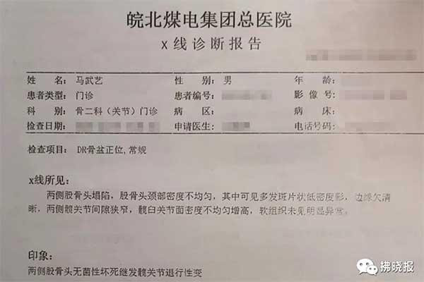 之前在工地干活時,馬武藝時常覺得腿疼,開始以為是干活累的就沒當回事,后來雙腿越來越痛。在程紅霞的勸說下,馬武藝到醫院做了檢查,被診斷為兩側股骨頭壞死。