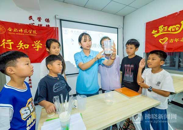 7月26日,在埇橋區(qū)西關(guān)街道祥安社區(qū)“七彩陽光”公益學(xué)堂,大學(xué)生志愿者正在為孩子們演示趣味物理小實(shí)驗(yàn)。