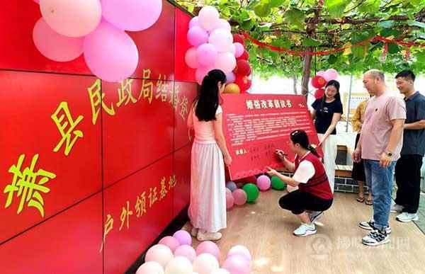 8月9日上午,3對(duì)青年在蕭縣民政局頒證師的見(jiàn)證下,領(lǐng)取結(jié)婚證。近年來(lái),蕭縣通過(guò)舉辦集體婚禮、頒證師見(jiàn)證、簽訂婚事新辦協(xié)議等,倡導(dǎo)婚俗改革,培育文明新風(fēng)。 特約攝影 李鵬